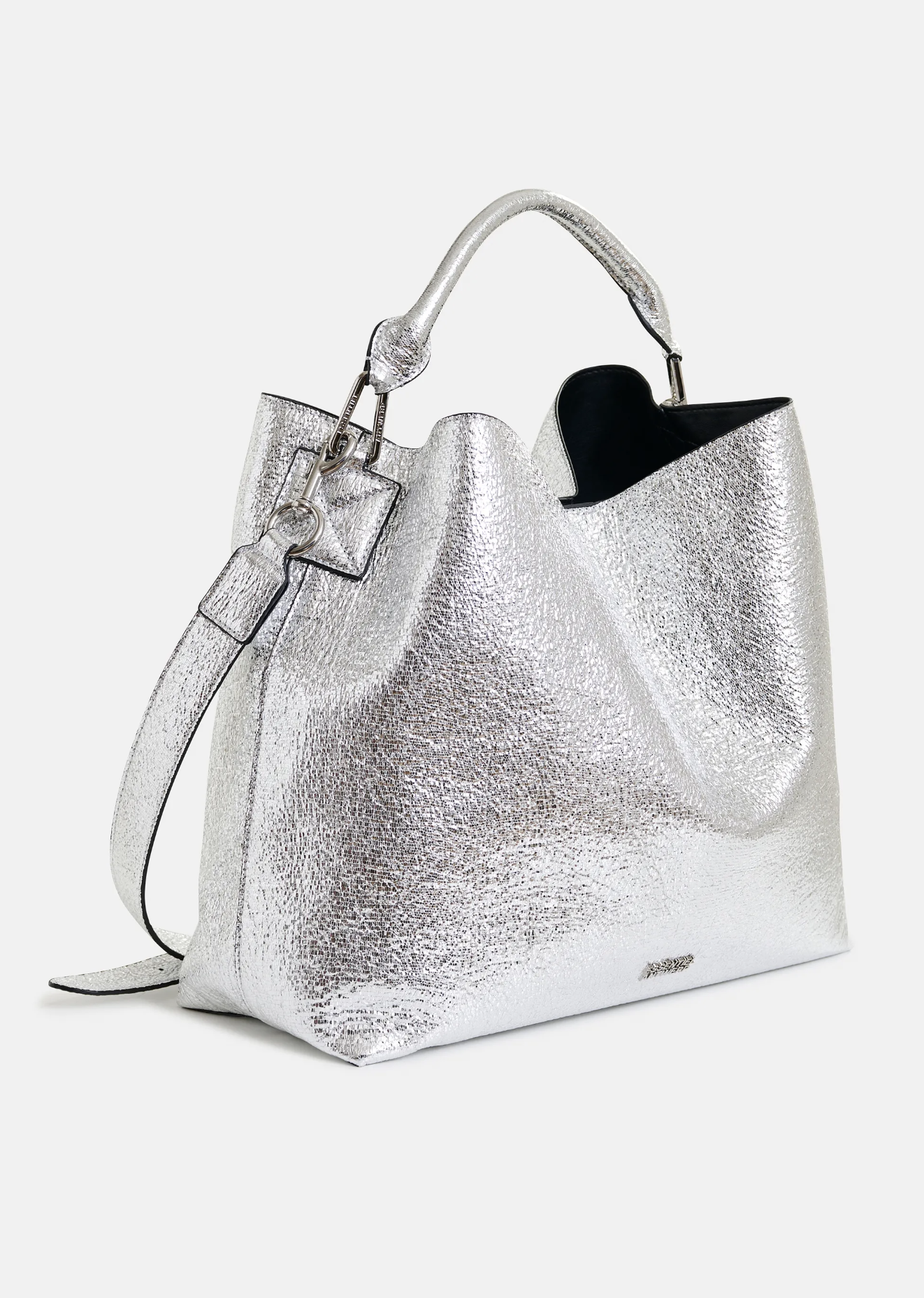 Crafted from a metallic faux leather in a slouchy, rectangular shape, this shopper bag is constructed with a comfortable rolled top handle for a chic handheld option. It also features a detachable shoulder strap for hands-free wear.The lined interior has a zipped pocket and card slot to keep small essentials secure and organized.