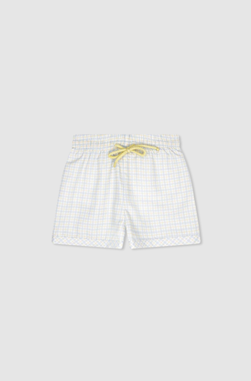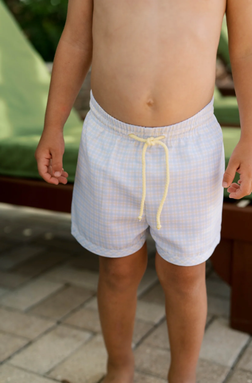 Ready for splashy summer fun, the Barnes Bathing Suit combines classic charm with a fresh twist. Crafted in Cornflower Check, this boys' swimsuit features a standout yellow tie detail for a pop of playful color.