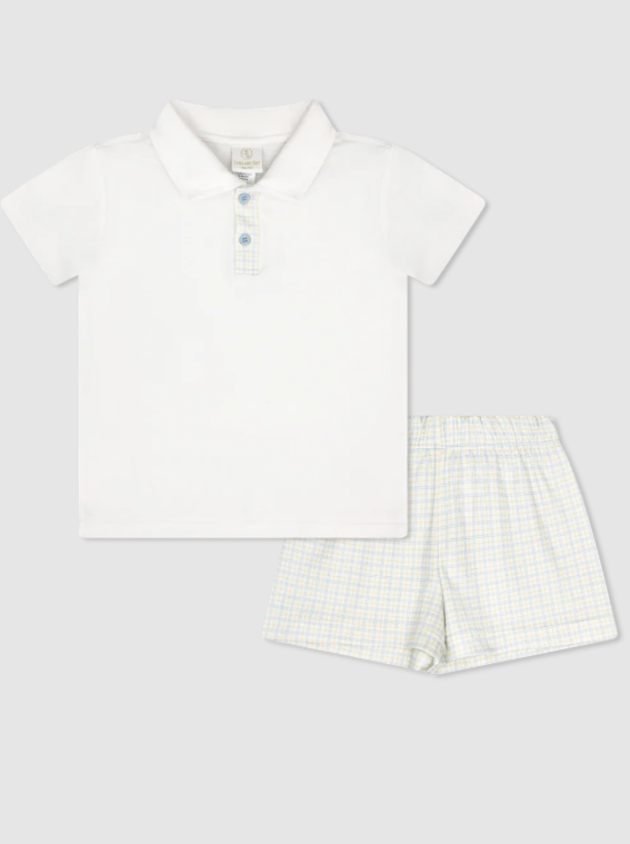 Fresh, classic, and perfect for warm-weather days, the Parker Polo Short Set features shorts in our signature Cornflower Check paired with a crisp white knit polo.