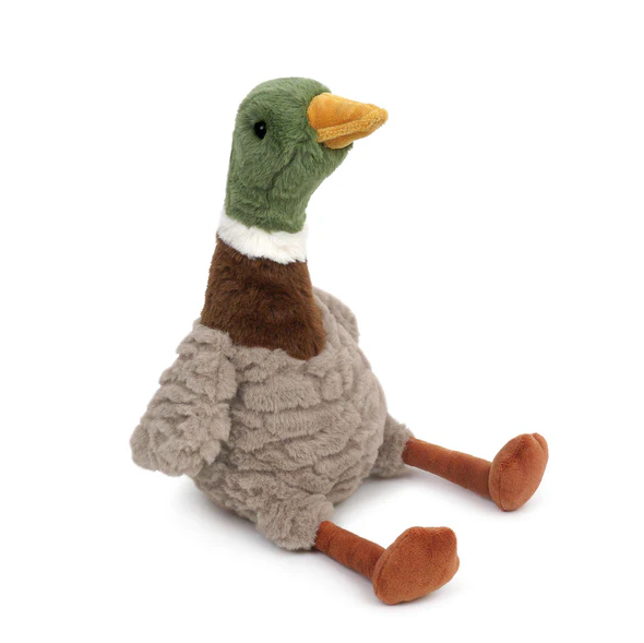 River Mallard Duck, the most charming and fluffy duck around! This plush mallard duck has all the beautiful markings of this colorful bird, with his bright green head, soft wings, and cuddly gray body, making him ready to waddle right into your heart. His long, floppy golden feet are perfect for cozy snuggles or taking a waddle around the house. Always ready for adventure or a lazy day by the pond, River Mallard Duck is the ultimate feathered friend to bring fun and whimsy to playtime.