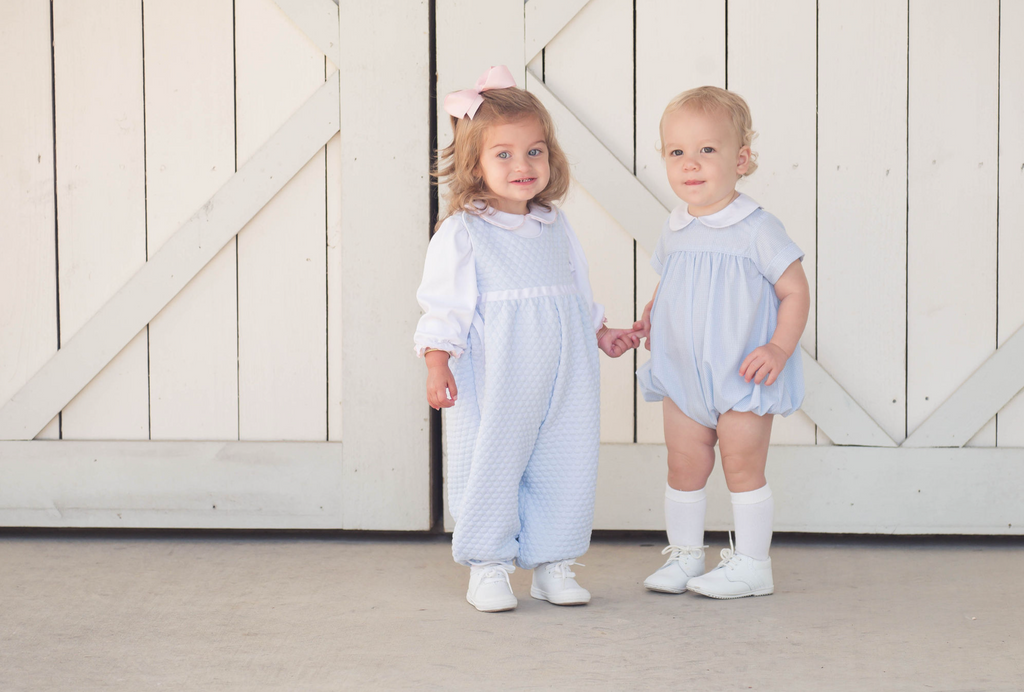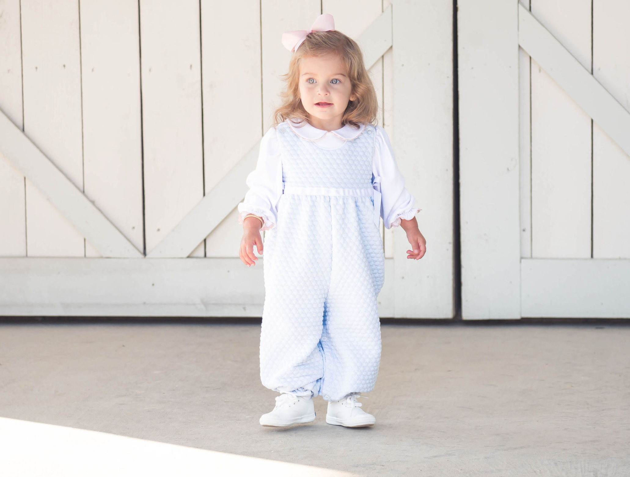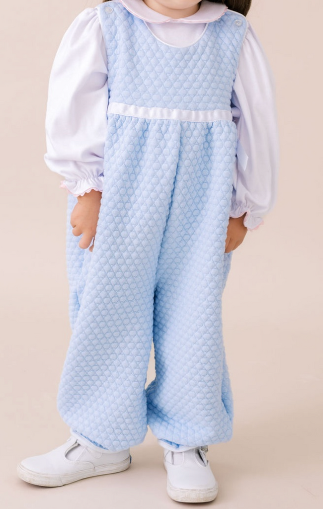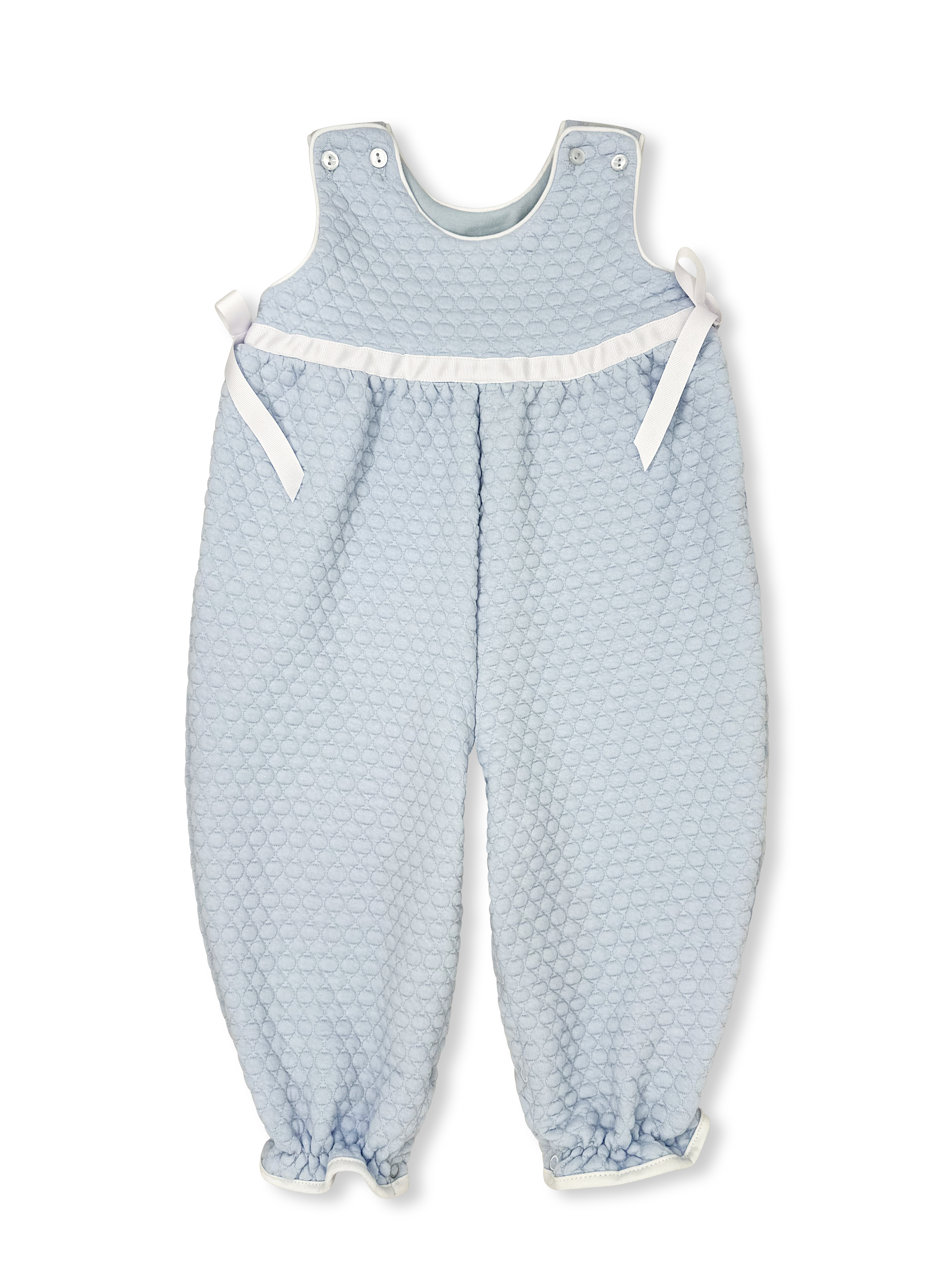 Rosie Romper in Windy Blue Quilted with White Grossgrain