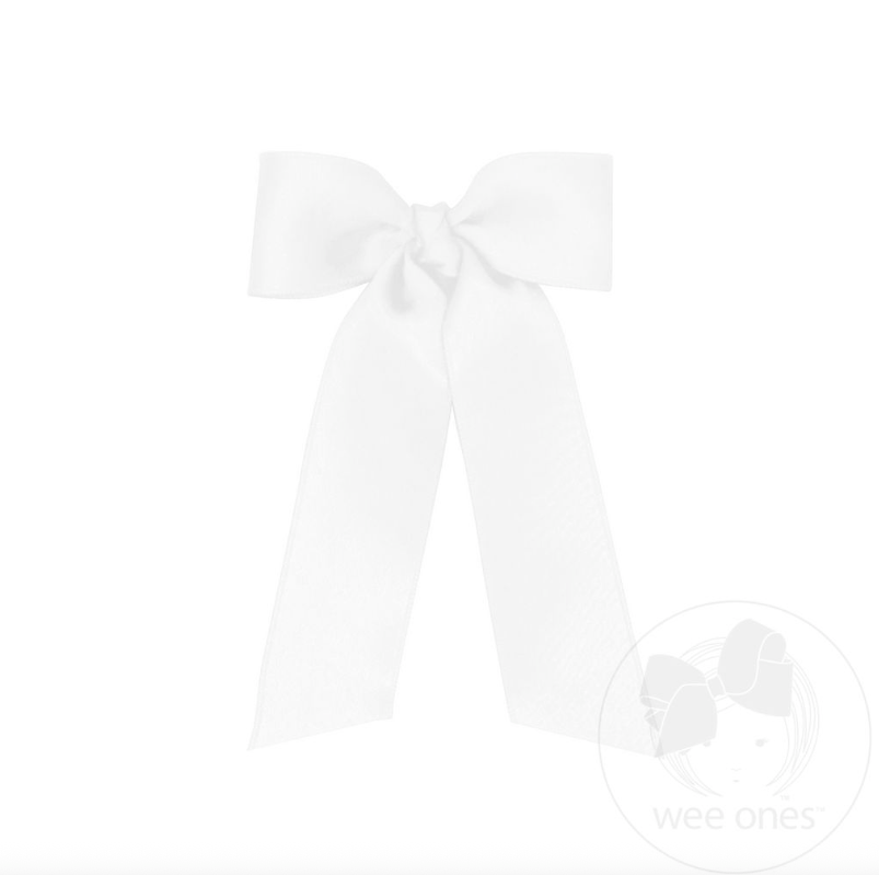 We're loving this hot new trend! Check out this adorable mini French satin bowtie with a knot wrap and 4.5 inch streamer tails. This bow is sure to stay in her hair all day with our patented WeeStay™ no-slip hair clip.