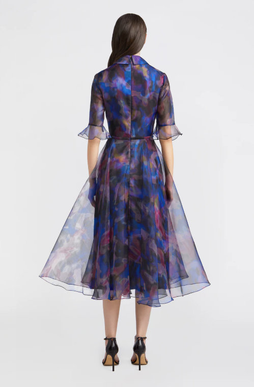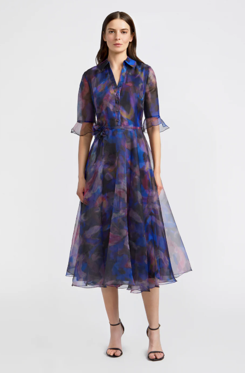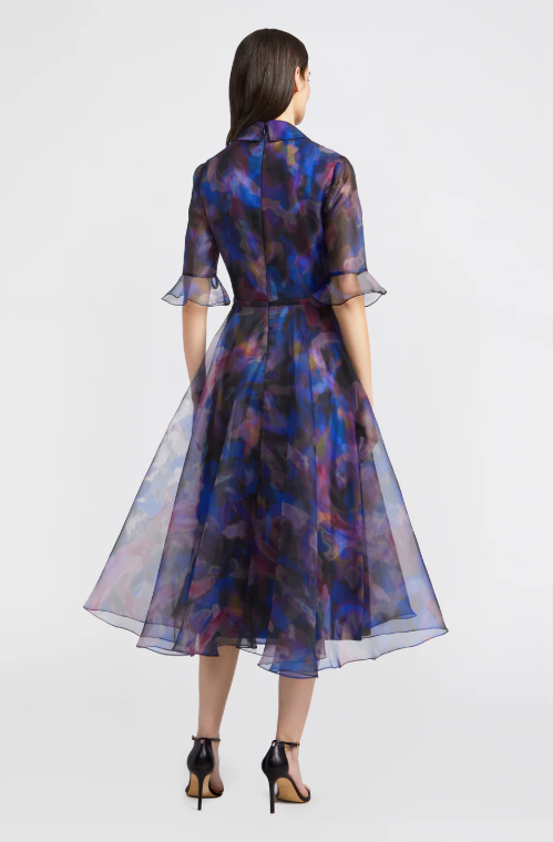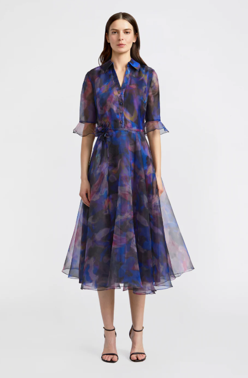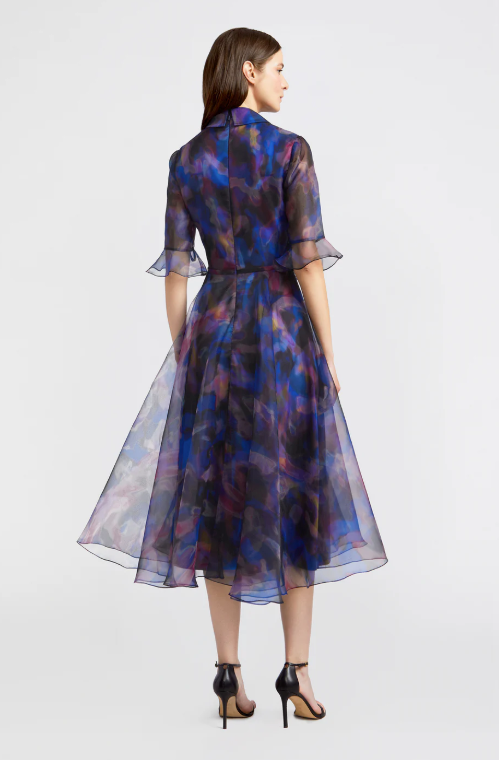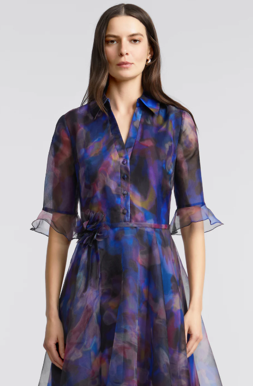 Printed organza shirtdress featuring a soft blend of abstract blues and purples with a sheer flounce sleeve. Finished with a tie belt and floral accent at the waist—a polished yet playful look for special occasion.