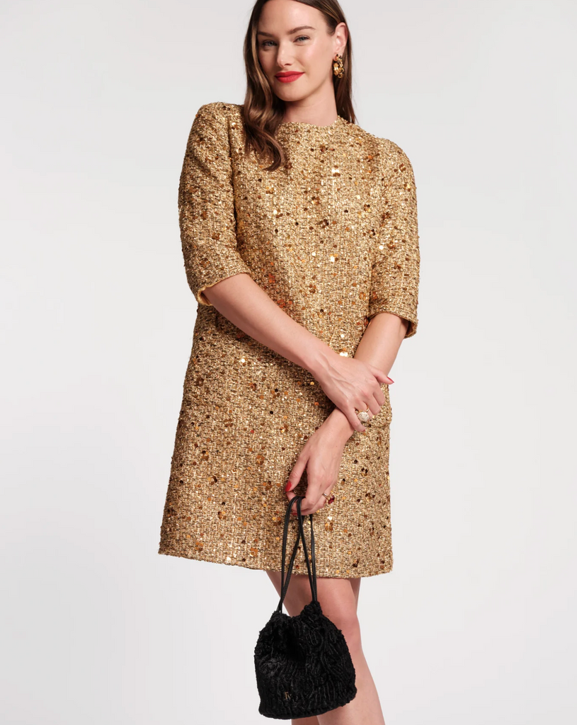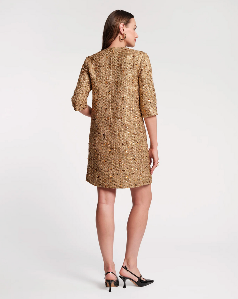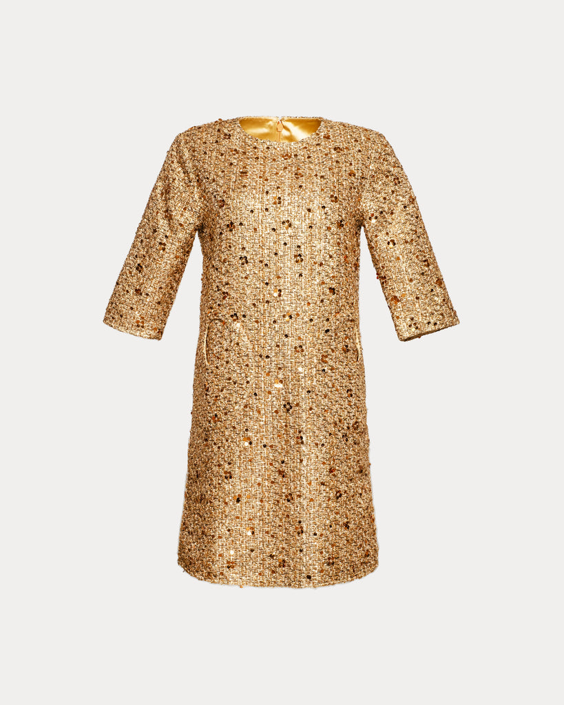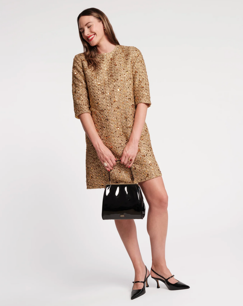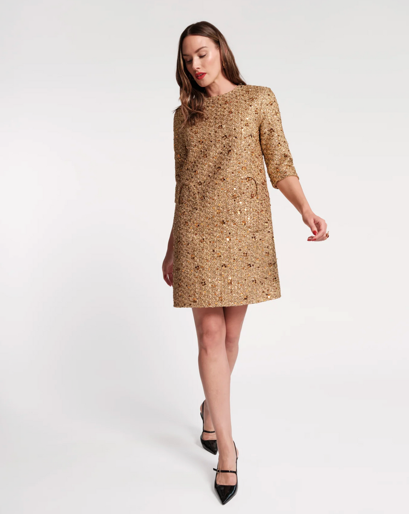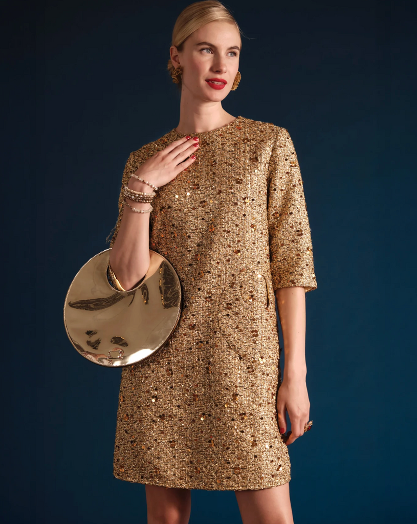 Shimmering metallic tweed meets timeless silhouette in the Mod Dress. Designed with a retro-inspired shift shape, this quarter-sleeve dress features a classic round neck, 3/4 sleeves, and unique circular pockets for that extra something-special. Speckled tweed is woven with glinting sequins and delicate embellishments along the trim, creating a refined, feminine statement perfect for holiday soirées or any special occasion.