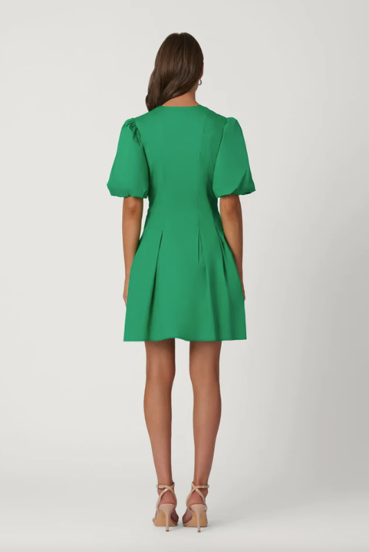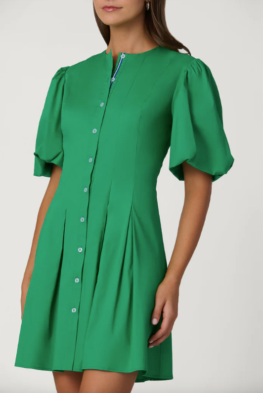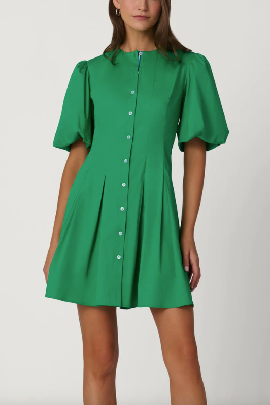 This super cute cotton mini has a functional front placket. The inside placket is embellished with a contrasting stripe ribbon. Fit and flare silhouette. Short puff sleeves with an elastic opening. Unlined.