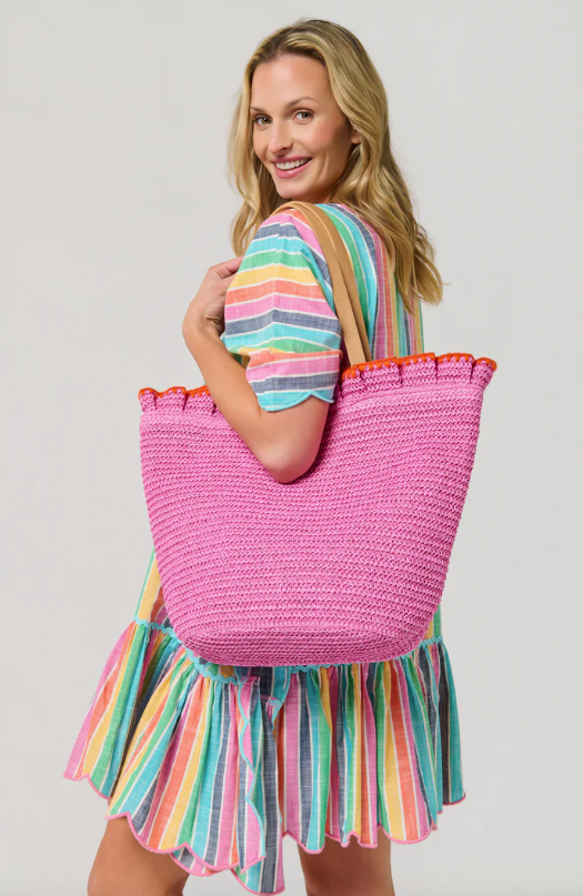 The Arabella Tote brings sunshine-ready style in every stitch, crafted with playful raffia-inspired textures and vibrant color combos. Featuring double shoulder straps, a magnetic snap closure, and an inner slip pocket, it’s designed to carry your beach day must-haves with ease. The ruffled trim adds a flirty twist, while the structured silhouette keeps your look polished.