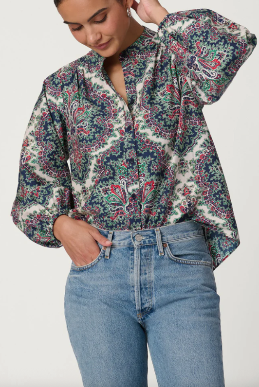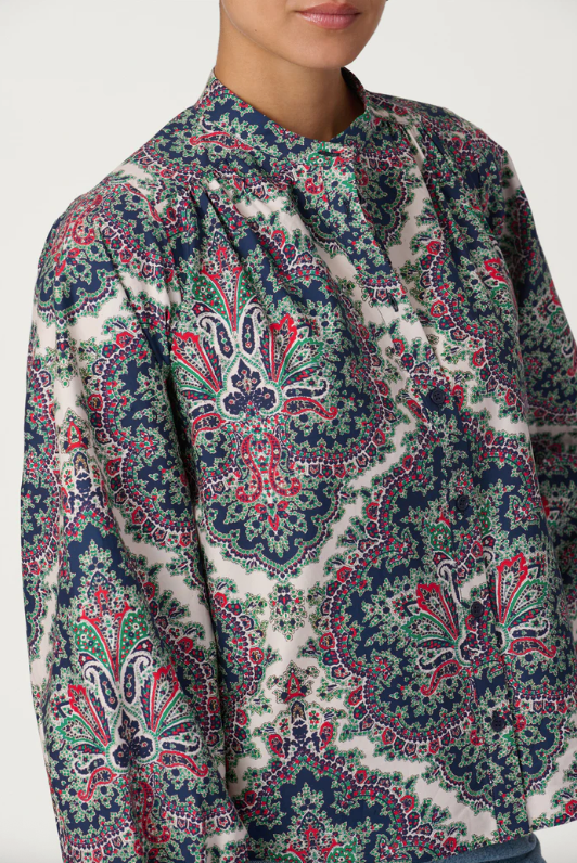 Button-front shirt dress in printed cotton fabric. The front placket features navy buttons for closure. Full-length sleeves with an elastic casing at the sleeve opening. Curved shirttail hemline. Unlined.