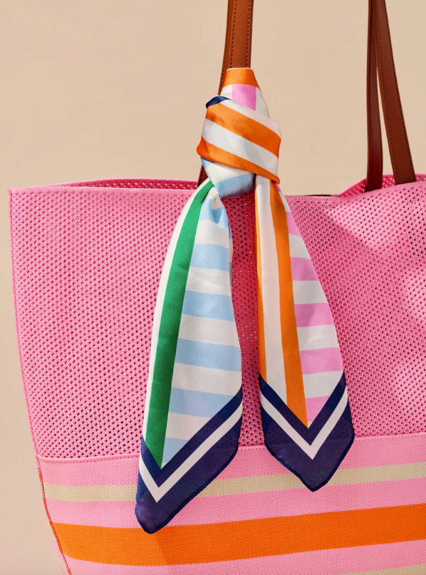 Add a pop of personality to any outfit with the Geo Scarf. This bold, multi-color accessory features vibrant diagonal stripes in orange, pink, green, and blue, all bordered by a classic navy trim. Lightweight and silky-smooth, it’s the perfect finishing touch whether tied around your neck, hair, or handbag. Designed to brighten up your look, the Geo Scarf is the ultimate playful staple for sunny days.