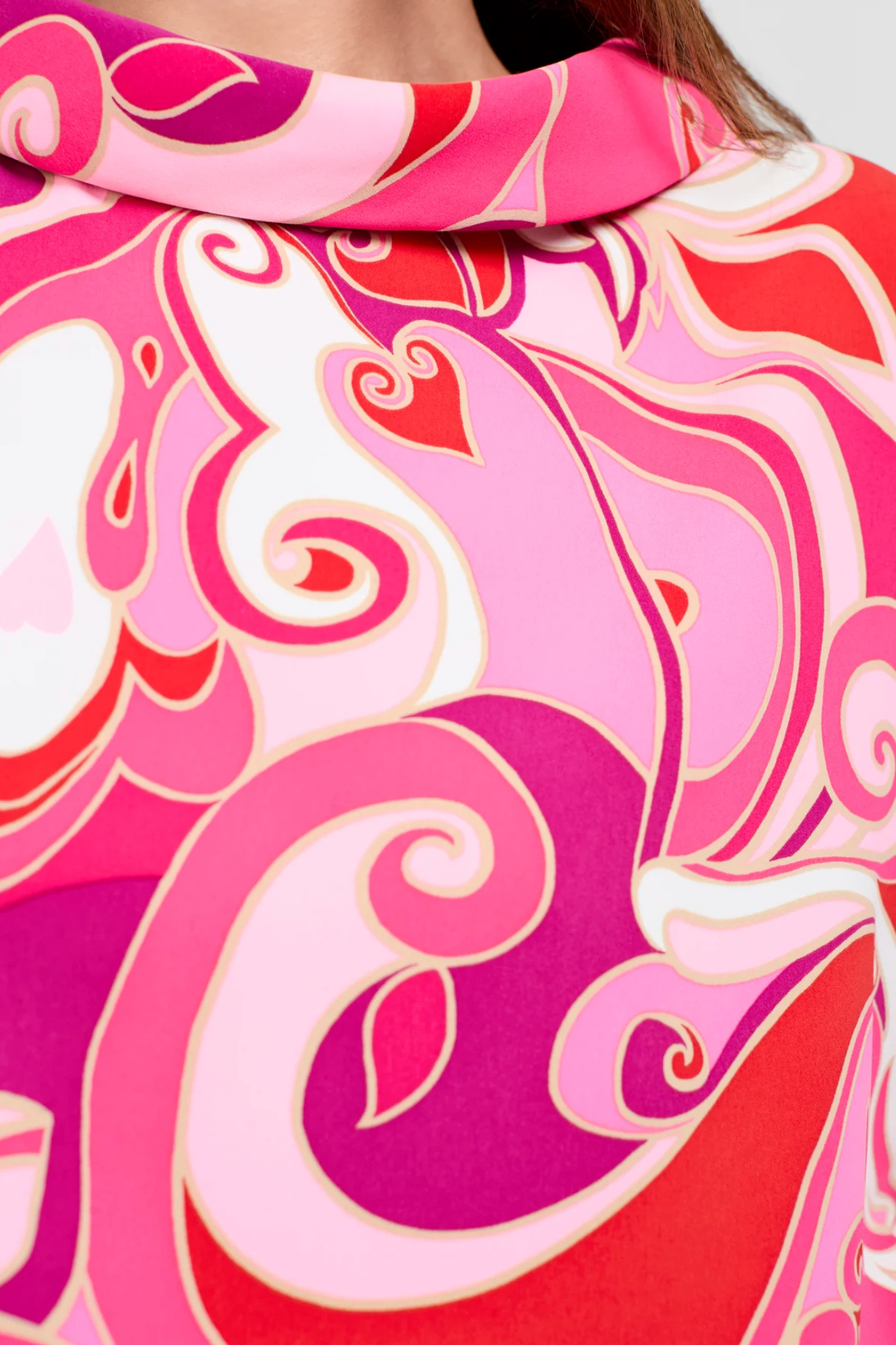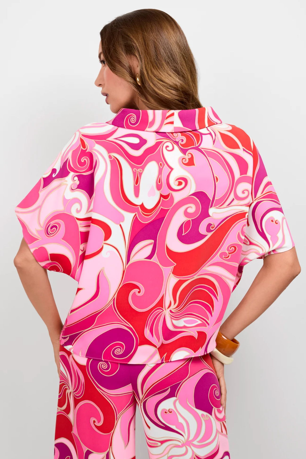 This airy top in lightweight double georgette has an elegant relaxed fit with a boatneck and dolman sleeves. It features a vibrant mod motif inspired by vintage silk.