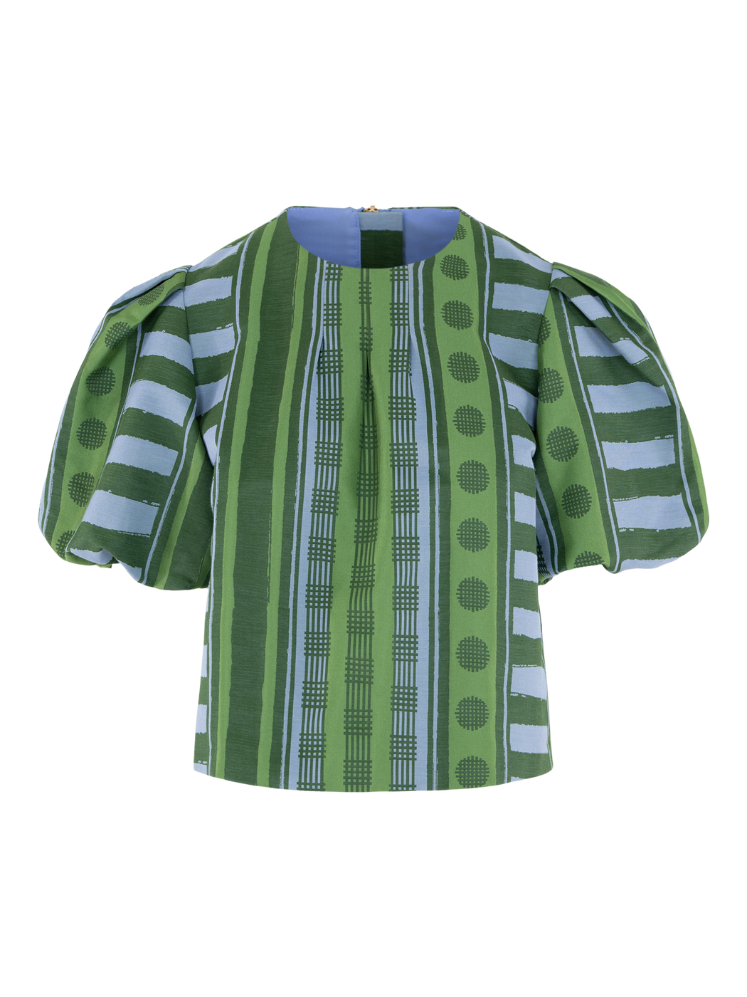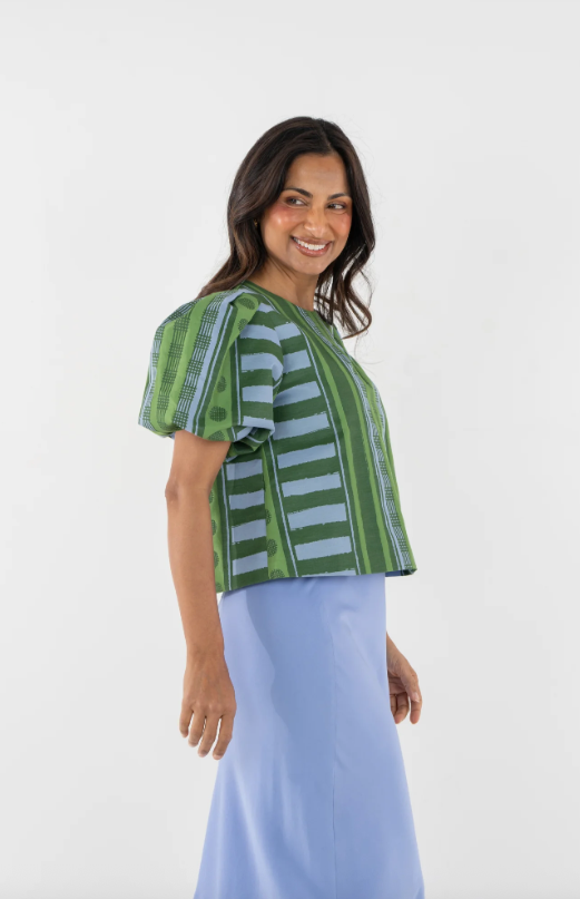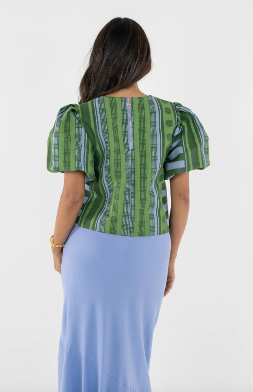 The Jane Top in Forest Jubilee delivers elevated charm with a fresh, playful edge. Featuring a boxy silhouette, this style is designed to feel structured yet effortless. Statement puff sleeves bring volume and balance, giving the top a polished presence with a touch of whimsy. Forest Jubilee showcases a dynamic intermix of patterns, printed on a luxe jacquard fabric that offers subtle structure and a gentle sheen. Perfect for adding dimension and personality to your everyday wardrobe.