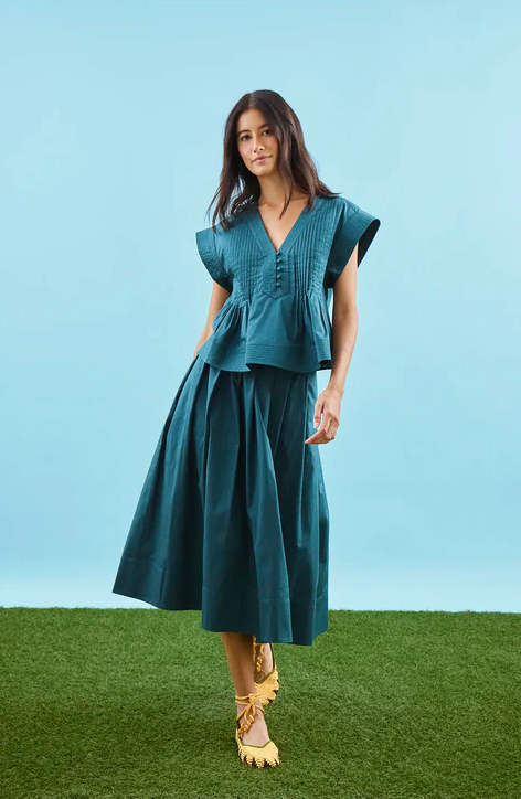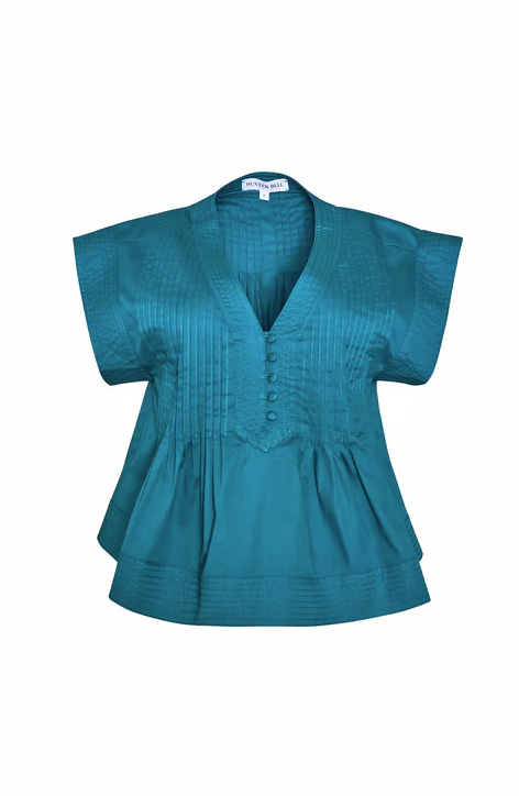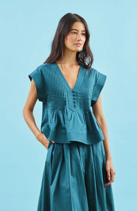 The Lola Top brings a feminine touch to everyday ease. Designed in our bold petrol green, it features a flattering V-neckline, delicate pintuck detailing, and short banded sleeves that add just the right amount of structure. The cropped, boxy silhouette is lightweight and breezy, making it perfect for warm days and relaxed moments.