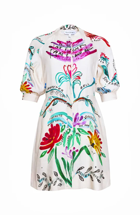 Meet the Molly Dress, crafted in our custom-designed linen-blend anniversary print. This button-front mini features a mandarin collar neckline, elbow-length full sleeves with tied openings, and a playful circle skirt. Finished with side-seam pockets, Molly is a fresh, feminine mini for the season.