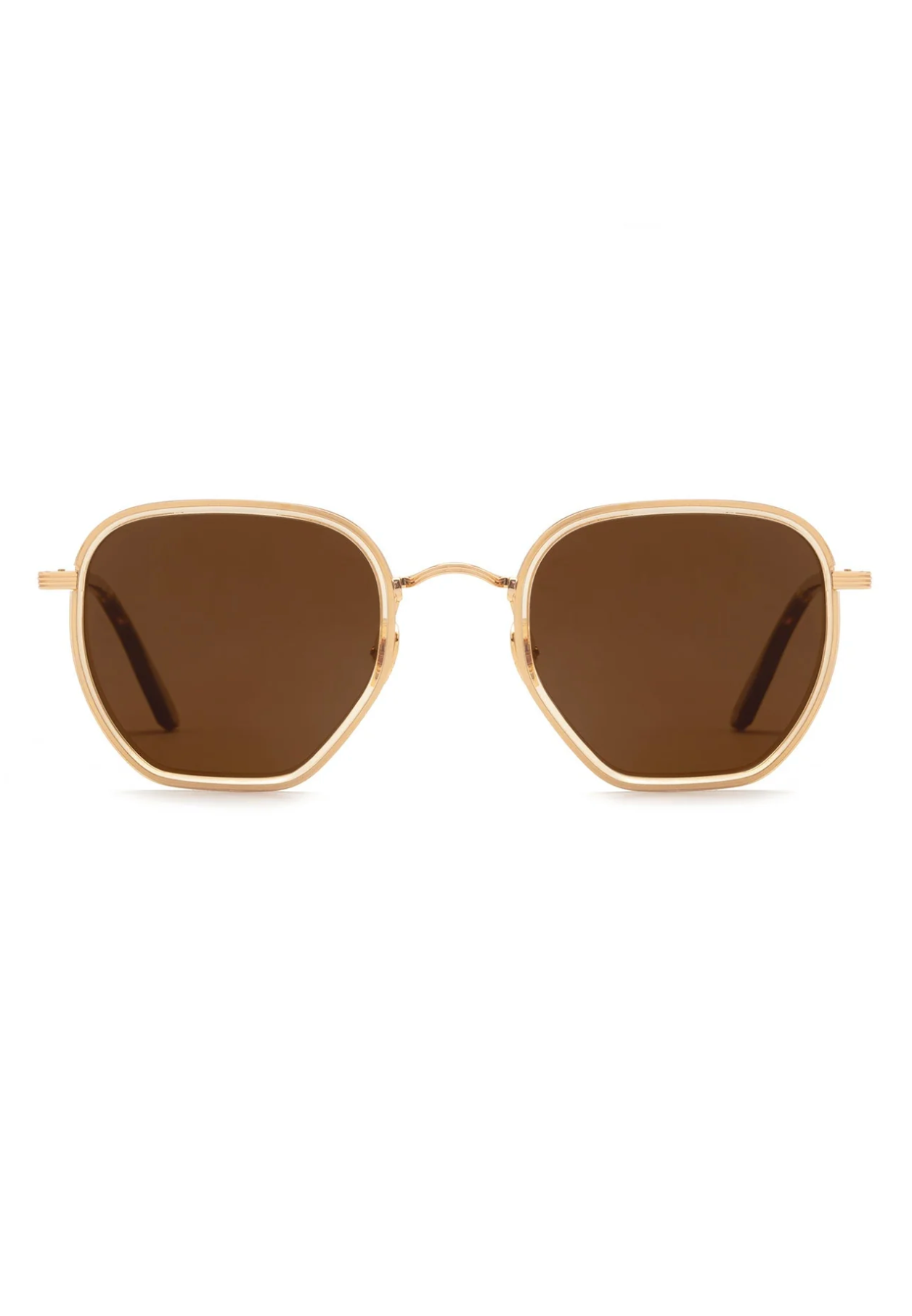 This handcrafted frame is a combination of glossy acetate and glossy 18K gold-plated titanium hardware