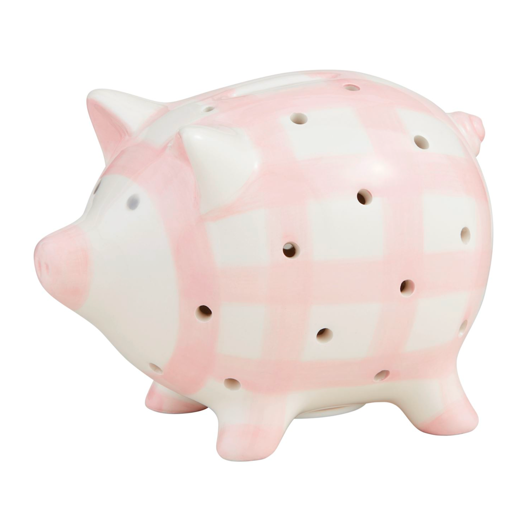 Hand-painted ceramic piggy bank with LED lights. Batteries included.