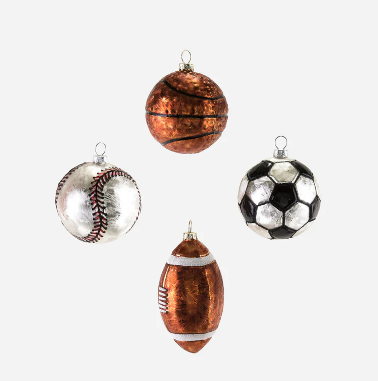 Celebrate your young athlete's passion with this delightful sports ball ornament set! Featuring four assorted glass designs in vibrant colors, these ornaments showcase classic basketballs, footballs, soccer balls, and baseballs. Ranging from 3.25" to 4.5" in size, they're the perfect keepsake to honor your little champion's love of the game. Hang them proudly on your tree and cherish memories of their sporting adventures year after year.
