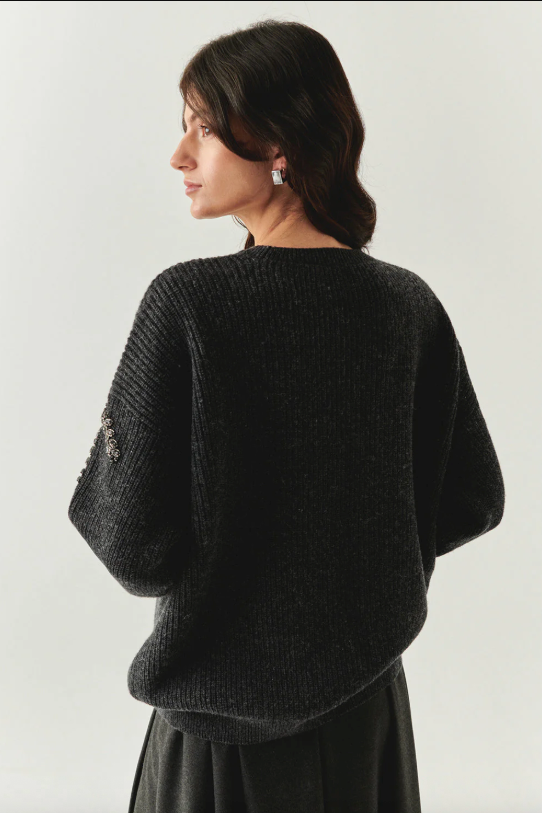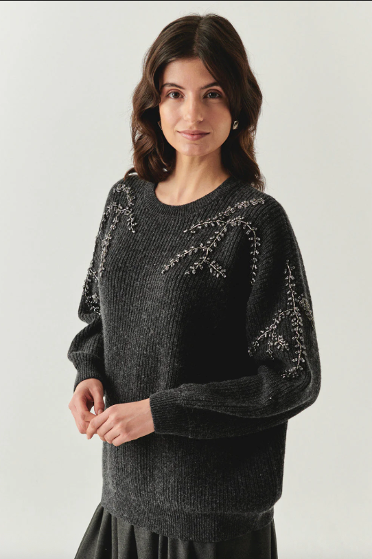 The Grace Sweater Blouse showcases a classic crew neck and relaxed fit, with embroidery and embellishment details for a festive, feminine twist.