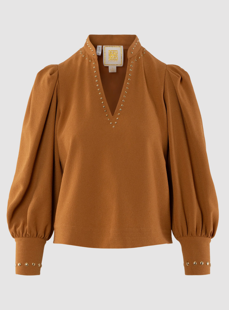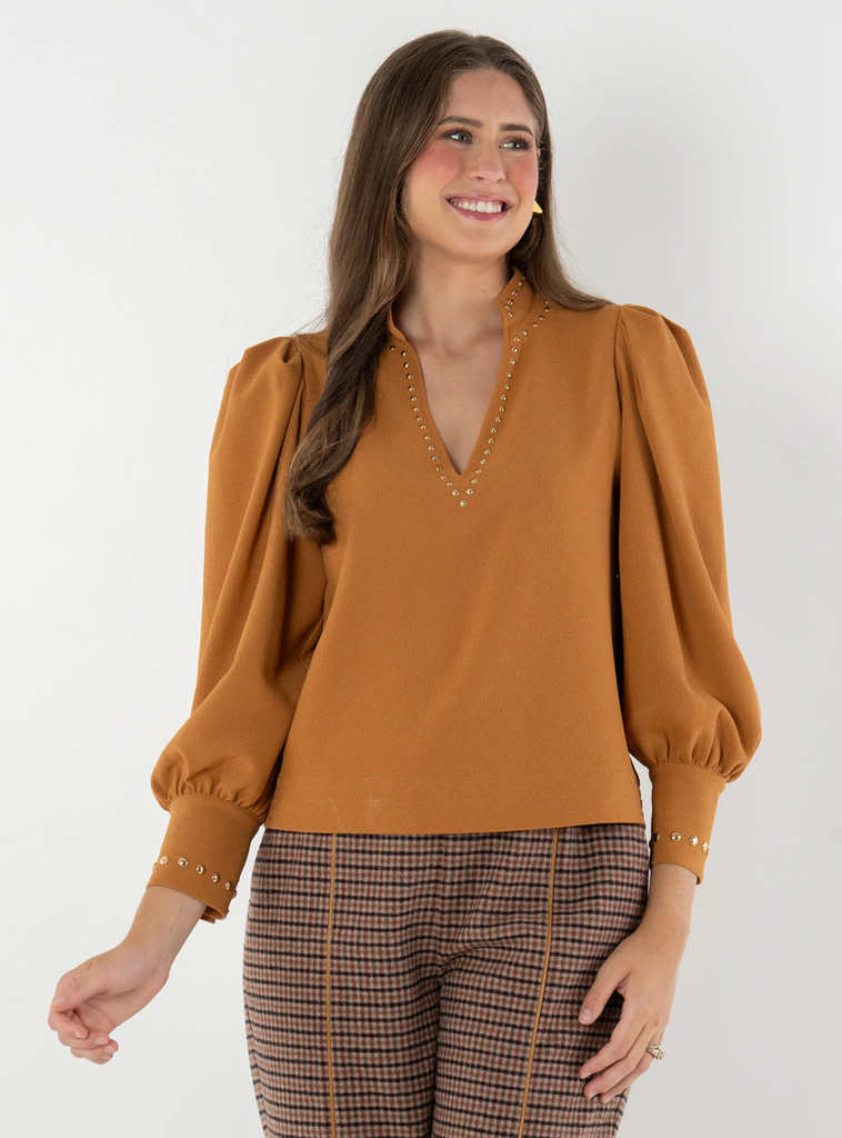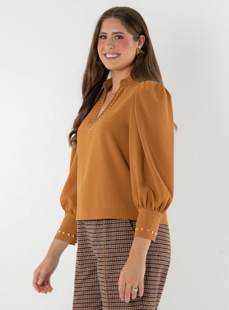 The Hampton Top in Brown Sugar brings a refined edge to everyday dressing. Featuring blouson sleeves with cuffed finishes and a flattering V-neckline, this silhouette is elevated by gold stud detailing along the neckline and wrist cuffs. The subtle western chic style adds a nod to Texas roots, while the warm tone and timeless cut make it a versatile piece for seasonal transitioning.
