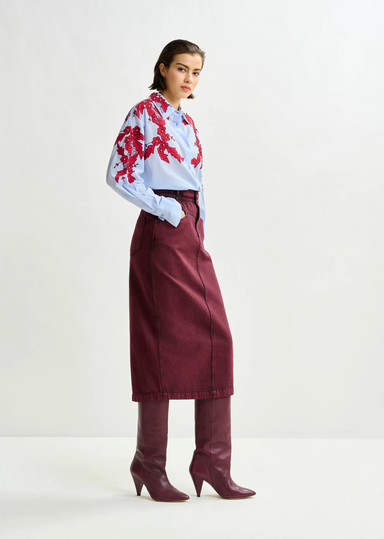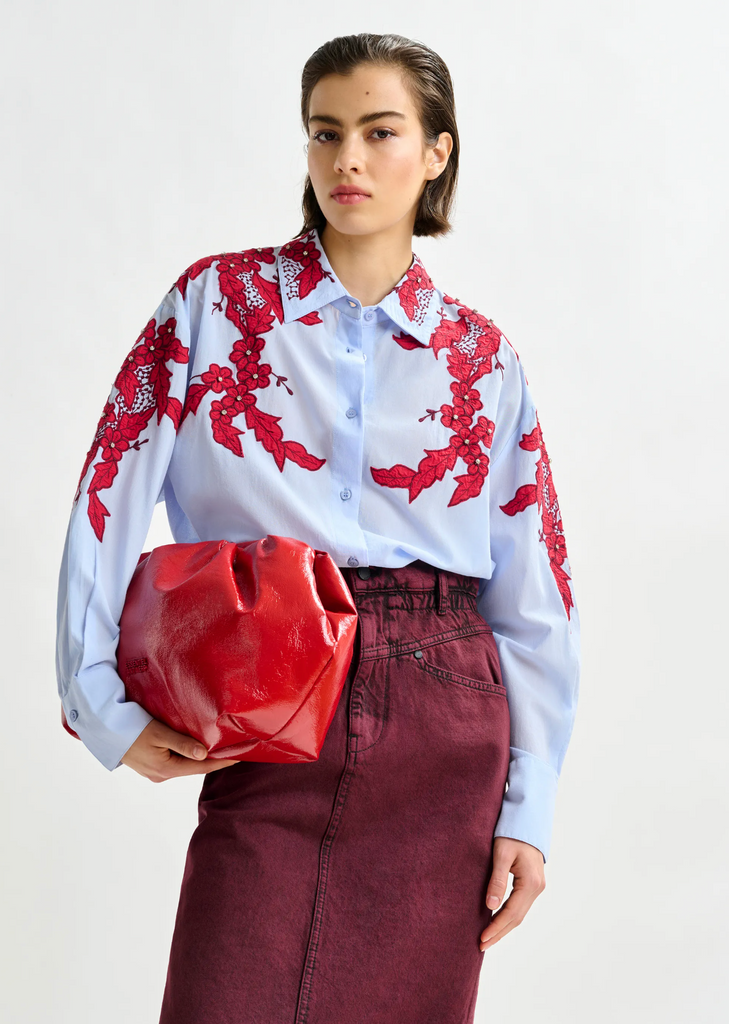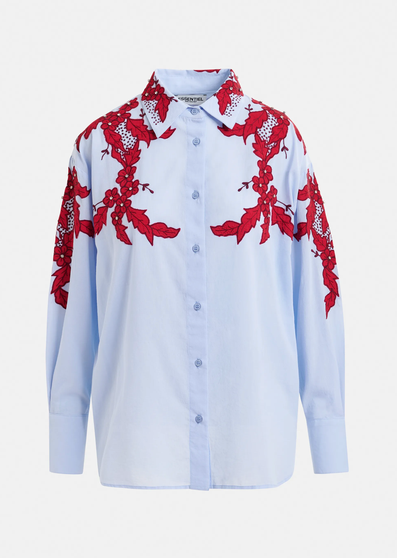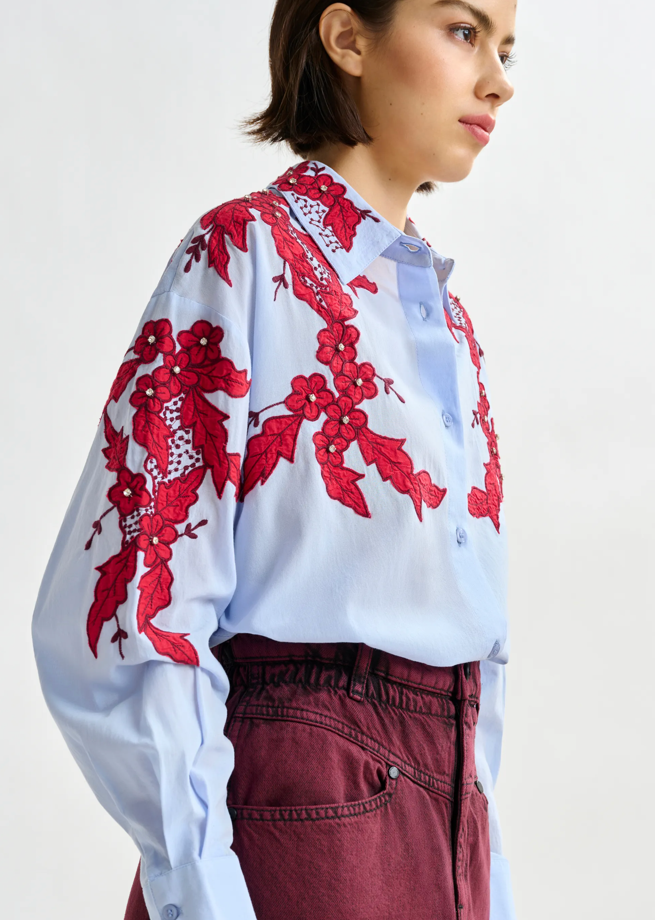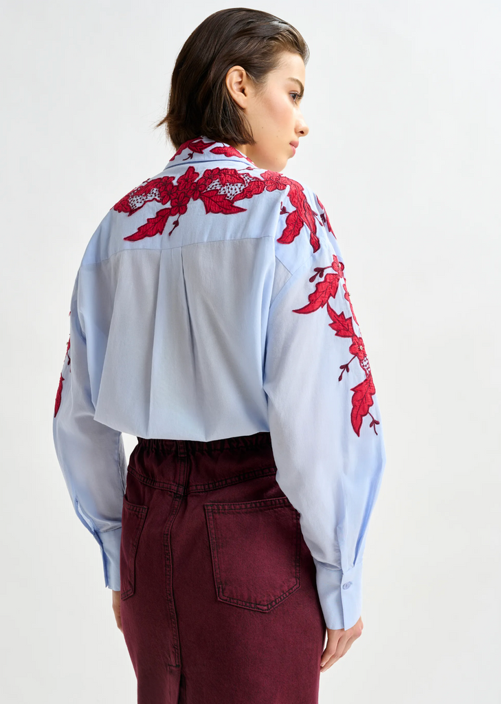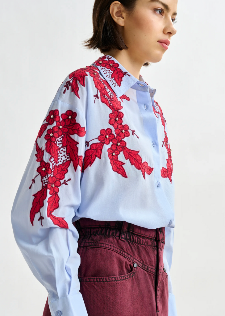 Cut from crisp 100% cotton, this shirt is designed for a relaxed fit with a boxy silhouette and dropped shoulders that enhance its laid-back appeal. It features intricate floral embroidery adorned with rhinestone embellishments. The classic button fastening is complemented by a rounded hemline with subtle side slits and a slightly elongated back. Ideal for elevating everyday staples with a statement twist.