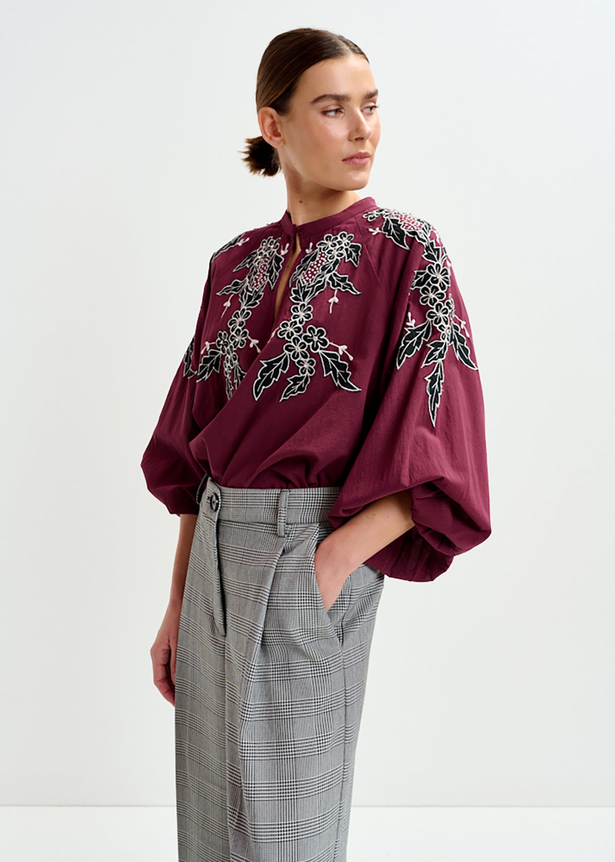 Elevate your wardrobe with the Ishimbay Embroidered Top in Margot Mauve. This blouse features delicate embroidery that adds refined texture and subtle elegance. Its tailored silhouette and soft hue create a sophisticated look perfect for both professional settings and stylish outings,