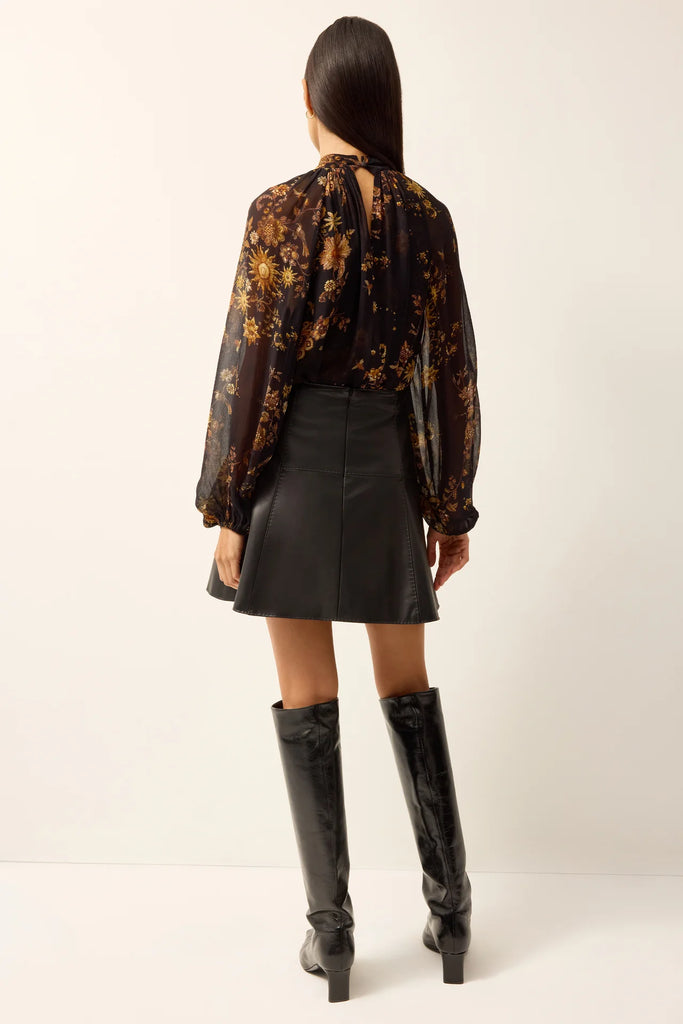 Scottie’s sheer raglan sleeves, stylish stand collar, and an elegant crinkle chiffon fabric create a captivating canvas for our new Gilded print, a photorealistic celestial floral against an inky black ground. Slip on silhouette with button and elastic loop at center back neck