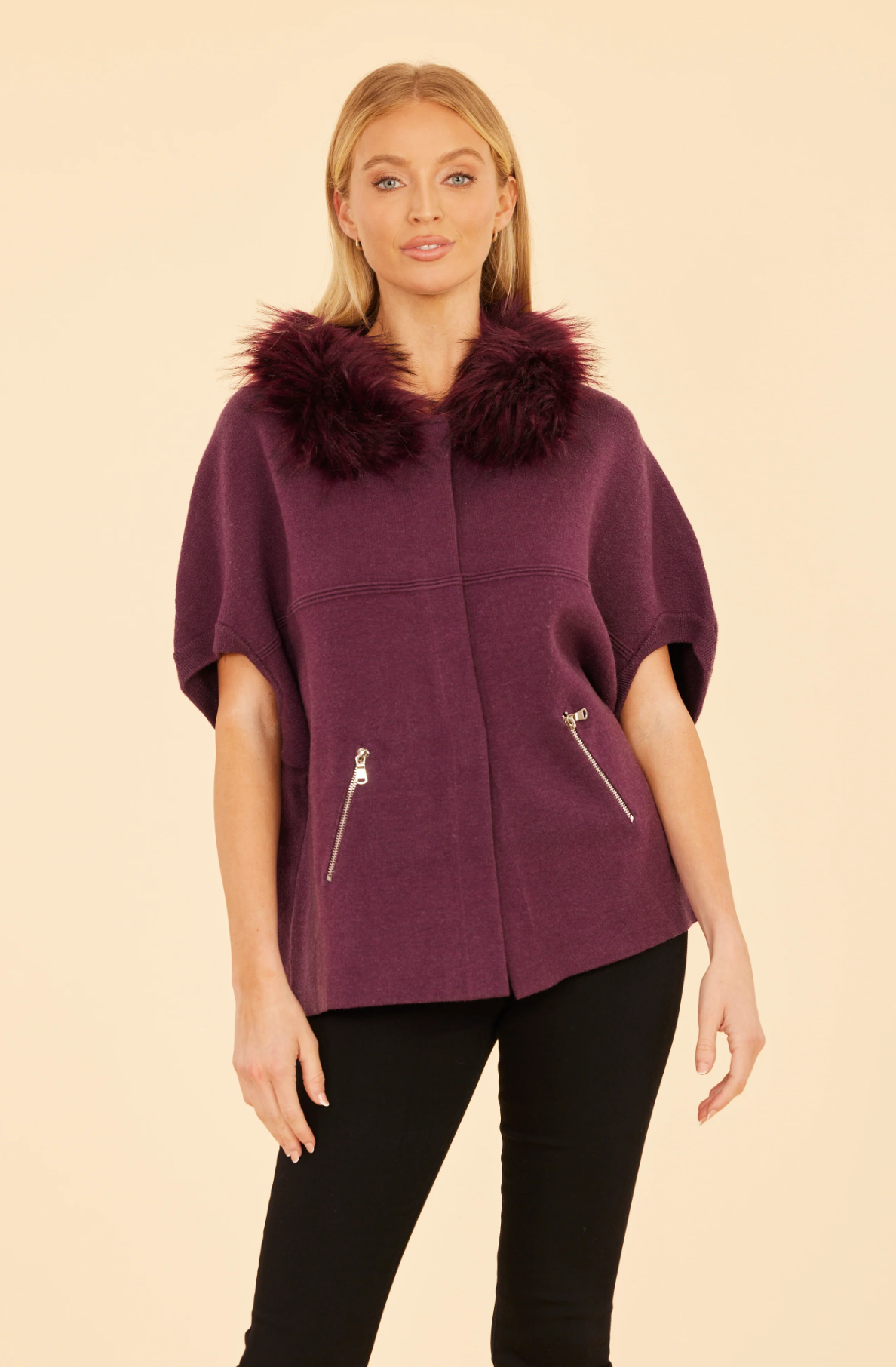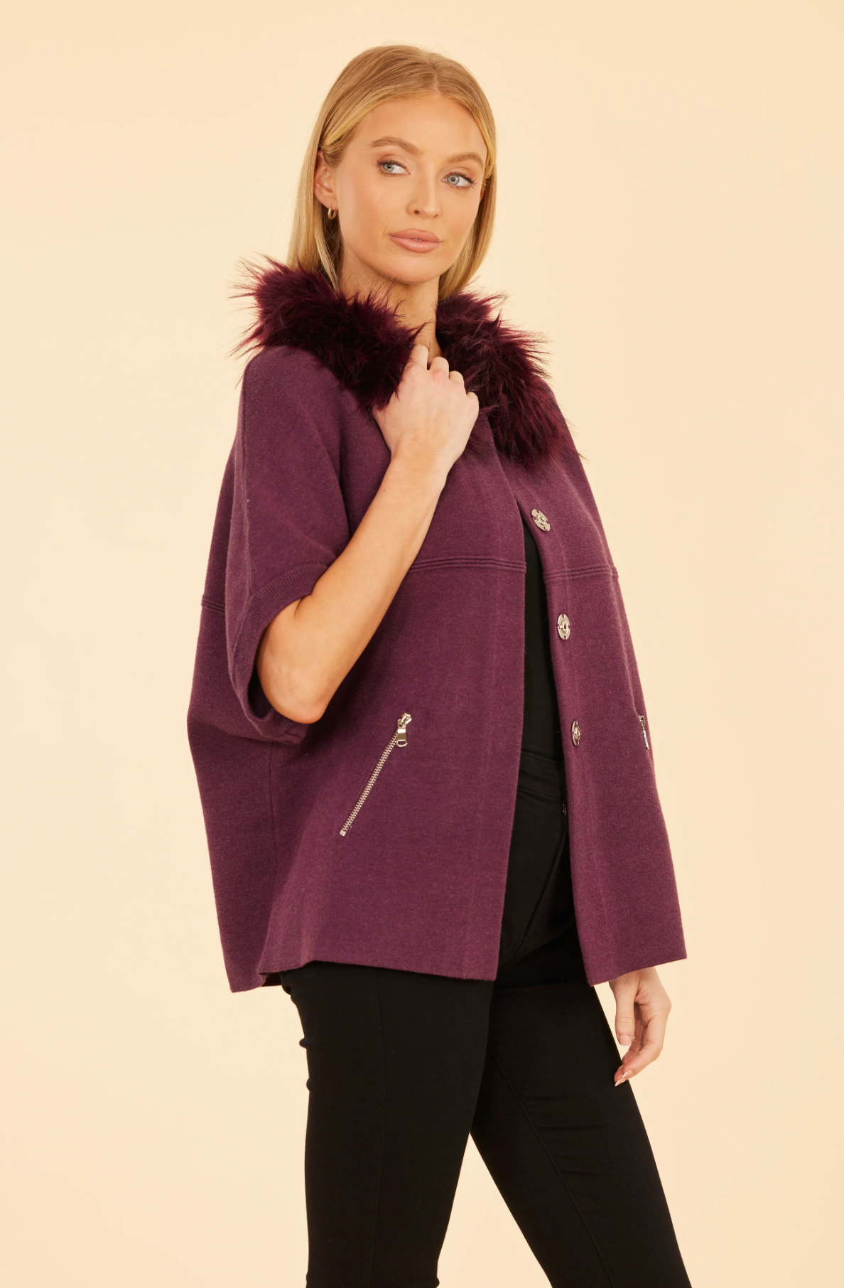 Perfect for a brisk autumn day, our Faux Fur Collar Short Sleeved Cardigan is a lightweight piece of outerwear that’s great for a versatile fall wardrobe. This chic cardigan features a luxurious faux fur collar that adds a touch of glamour to your ensemble, while the snap button closures ensure a clean, elegant look. The short sleeves provide a relaxed silhouette, making it perfect for layering over long-sleeve tops or dresses while offering a cozy fit that is both stylish and comfortable.