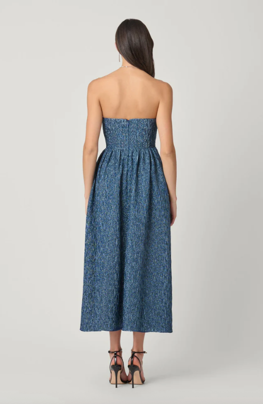 This beautiful metallic dress has an asymmetric neckline with a pleating detail on the bodice. The full skirt has small pleats at the waist, and side seam pockets. Dress is ankle length. Fully lined with inside bustier for added support. Center back invisible zipper.