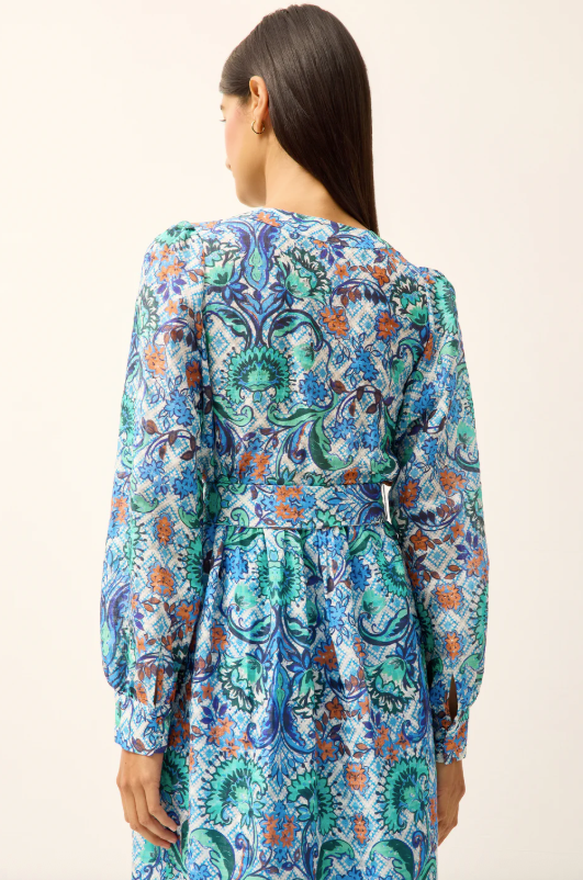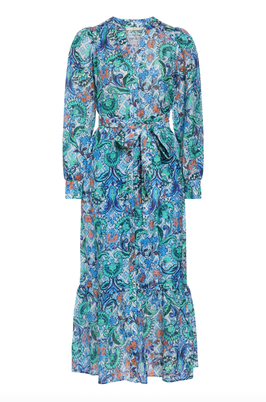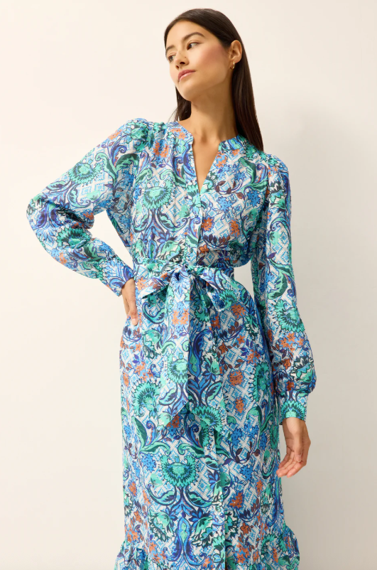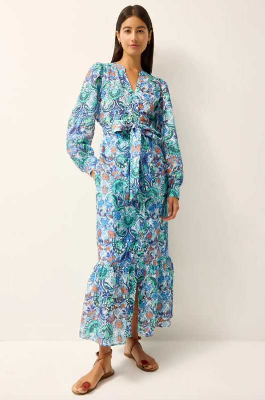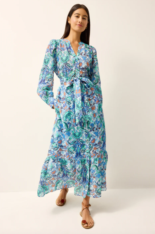 Hannon is a maximalist’s maxi. Marie Oliver’s take on the classic shirt dress, this feminine silhouette features a functional button front, shallow v-neck, subtly puffed sleeves, and an optional tie belt. But it’s our bold blue Chateau print that takes Hannon over the top for spring.