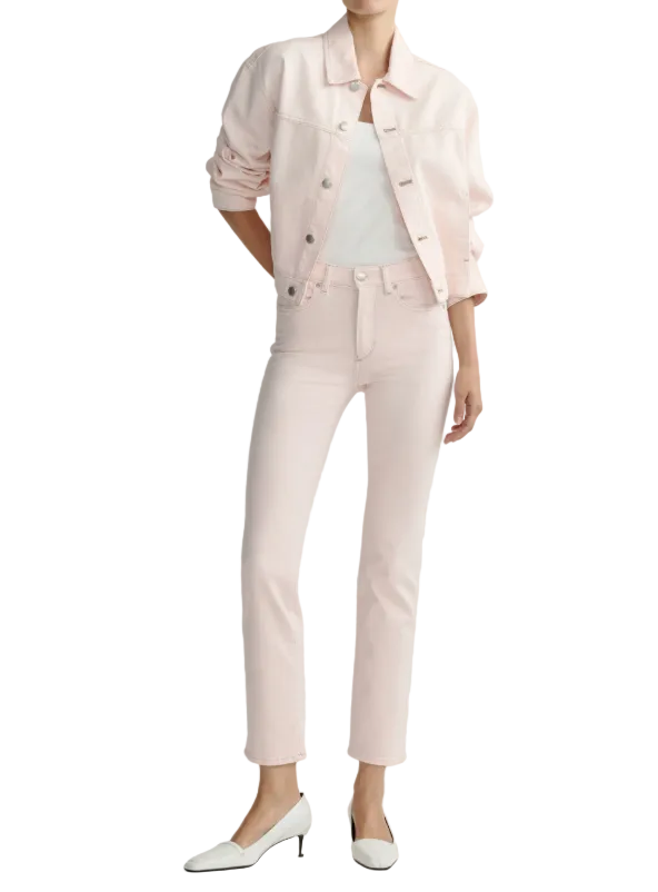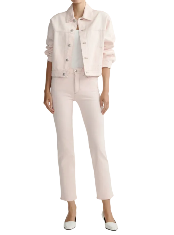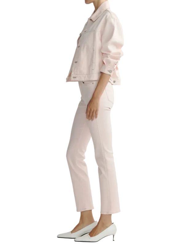 Ballet is a soft, blush pink denim. It features silver hardware, khaki stitching, a clean hem and an ecru back patch.
