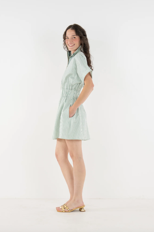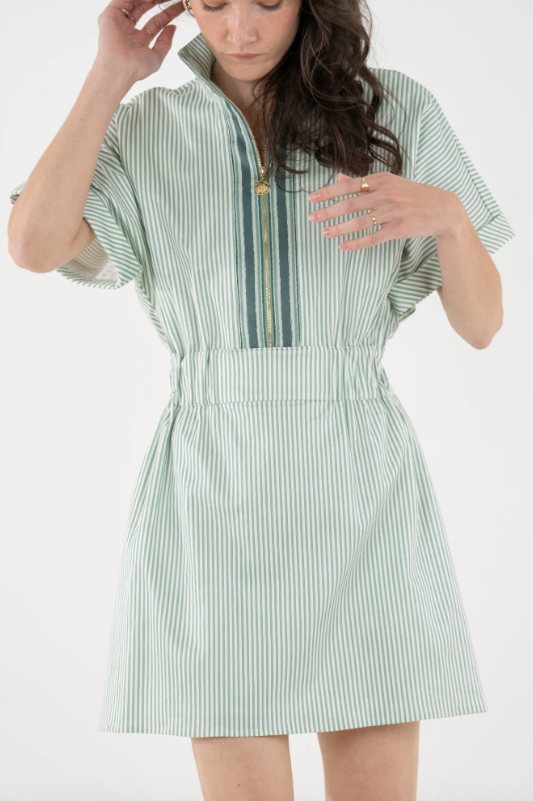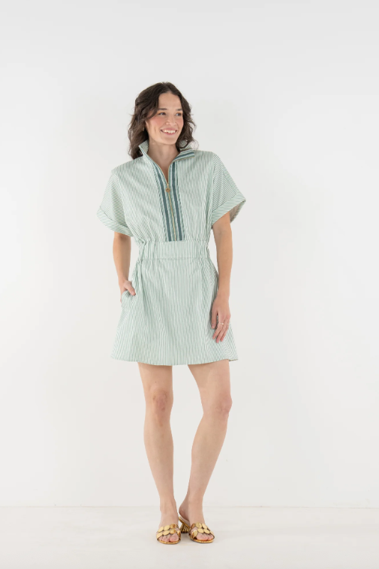 The Pullover Dress in Feldspar Stripe blends classic ease with a sporty, modern feel. Designed with a zip-front neckline finished with our gold logo pull, this style features short dolman sleeves, a cinched elastic waistband, and functional side pockets for everyday wear. Effortlessly versatile, it transitions seamlessly with a simple change of shoes or accessories—making it a polished, practical staple for spring and beyond.
