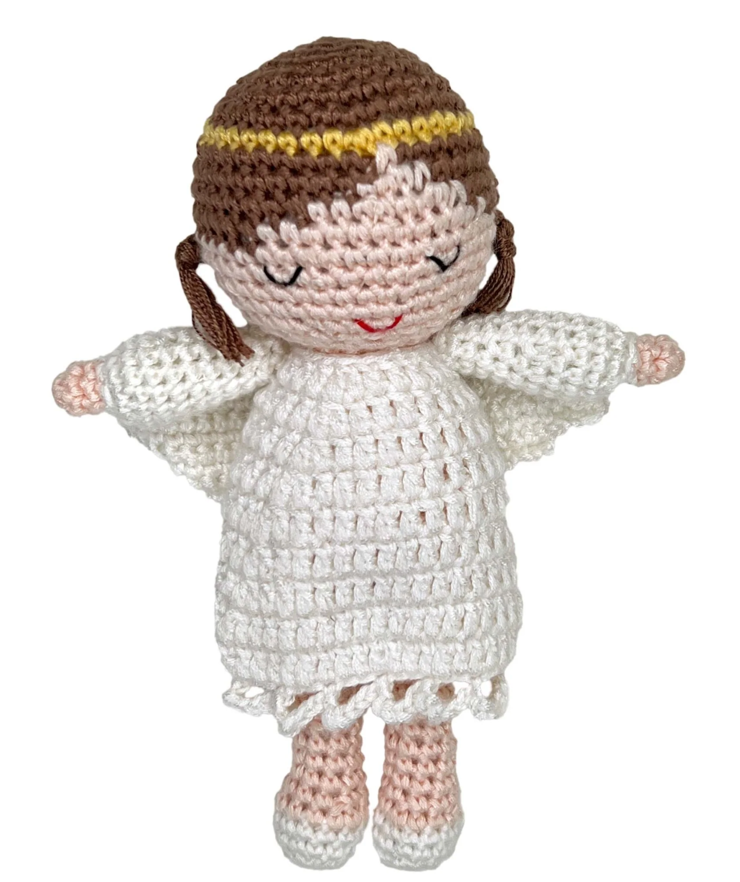 Features a bumpy crochet texture that is perfect for little hands to grasp and hold while also helping to develop babies sense of touch and feel. This organic crochet angel rattle is also easy to care for, just machine wash and lay flat to dry!